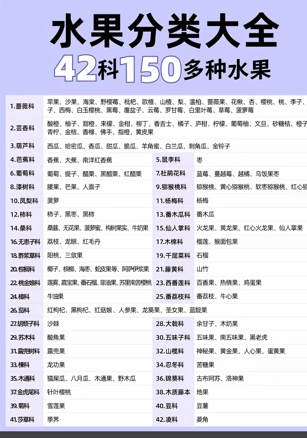 本内容来自于网络,请自行辨别参考...国内水果树名称大全(按类别整理,含小众品种) 一、落叶果树(南北适配,含冷门种) 1.仁果类:苹果、梨、山楂、海棠果、花红、楸子、沙果、槟子、榅桲2.核果类:桃、李、杏、樱桃、梅、李梅、杏李、樱桃李、欧李、郁李、毛樱桃、山桃、稠李、山杏、扁核木(蕤核)3.浆果类:葡萄、猕猴桃、软枣猕猴桃、狗枣猕猴桃、树莓(红黑黄树莓)、黑莓、醋栗、穗醋栗、黑加仑、蓝莓、高丛蓝...